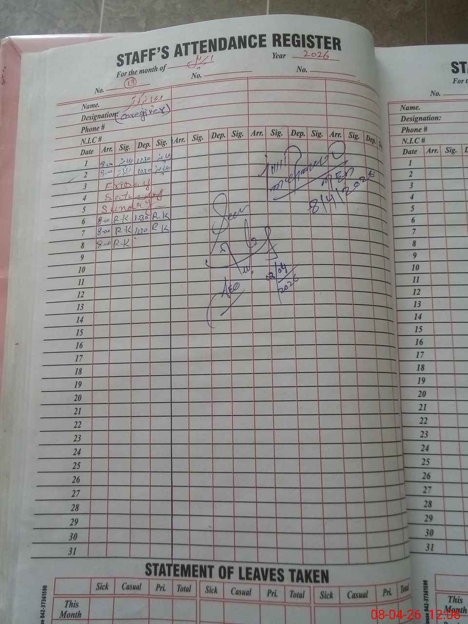 | CNIC | Full Name | Designation | R/C | Absence During Last Calender Month |