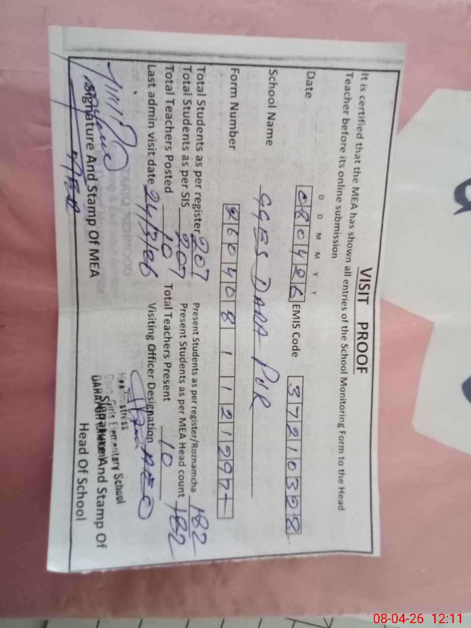 | Certified that this School was Inspected by the Undersigned MEA/DMO Today and the Information Stated Above is as Per Record. | |||||