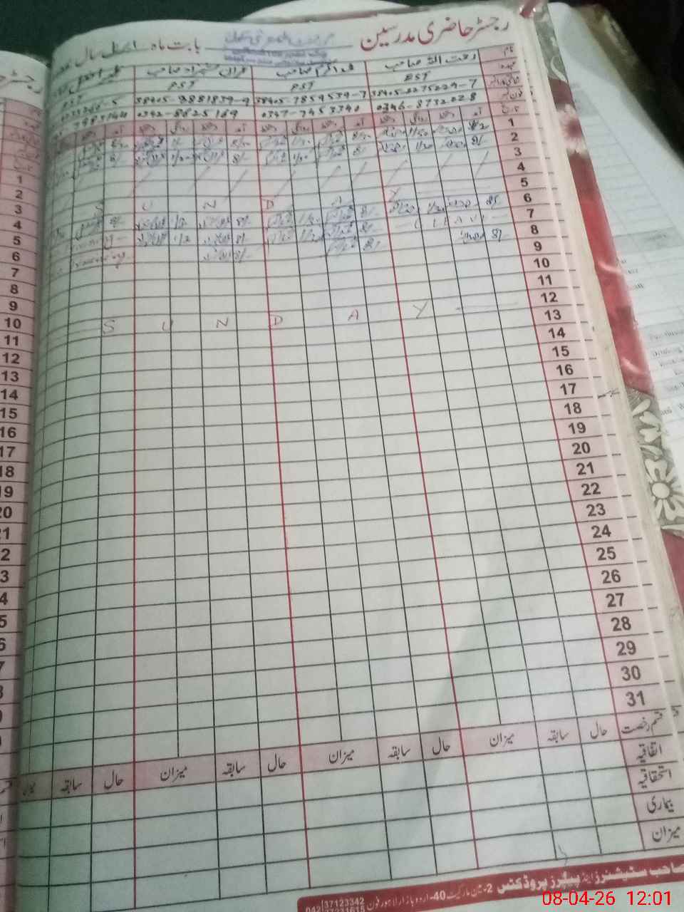 | CNIC | Full Name | Designation | R/C | Absence During Last Calender Month |