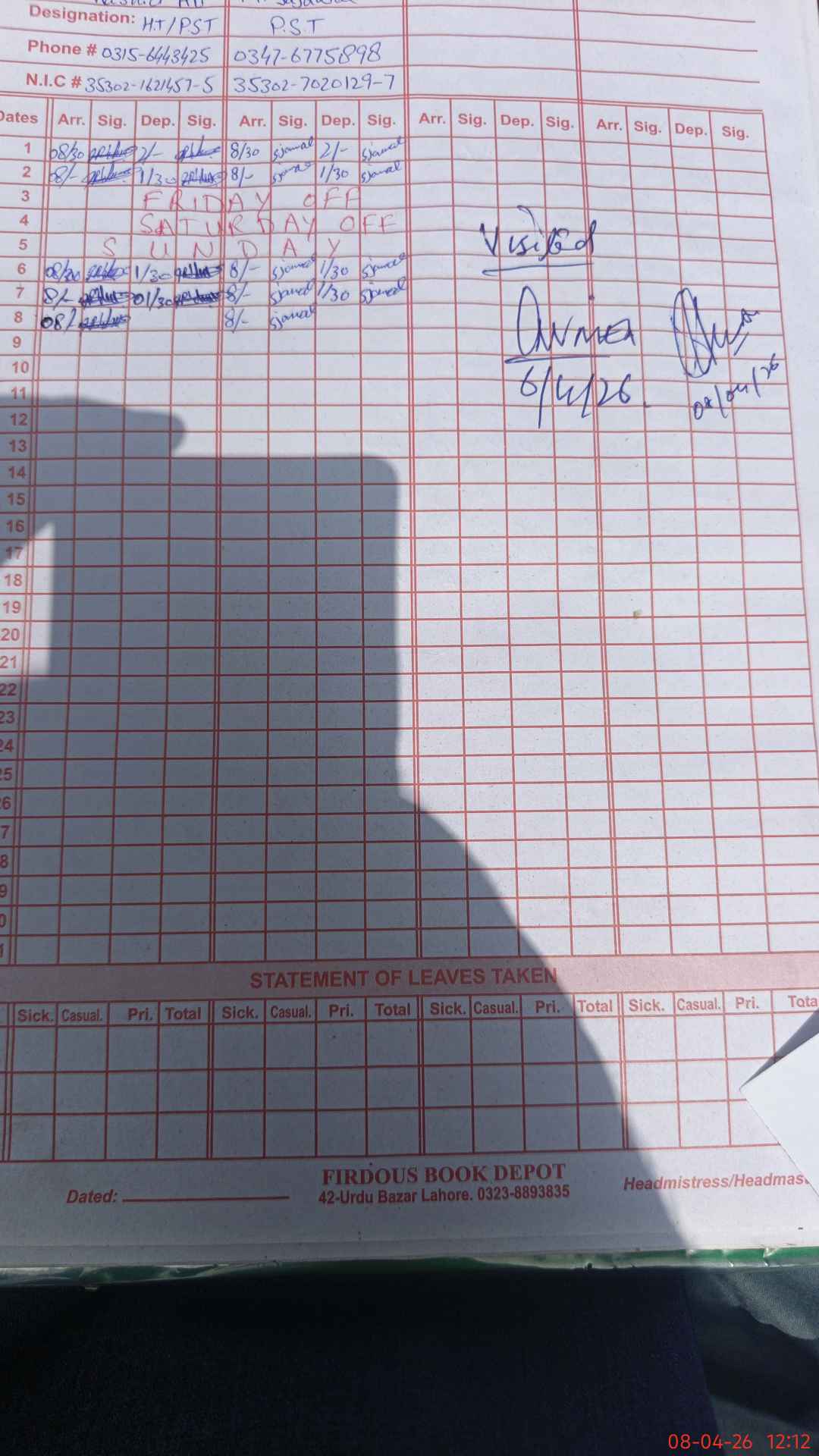 | Name: Ra**** Al**** Designation: (School Headmaster's/Headmistress's) PST Phone/Cell Number: 03**** |
