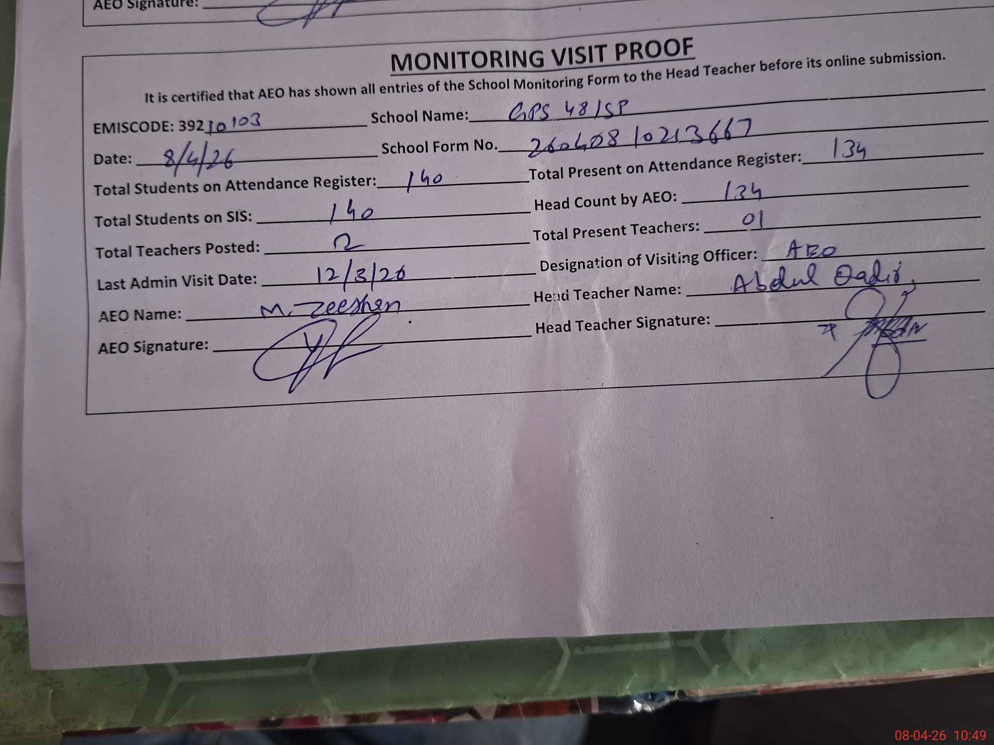 | Attendance Register | Head Teacher | MEA with School | Visit Proof |