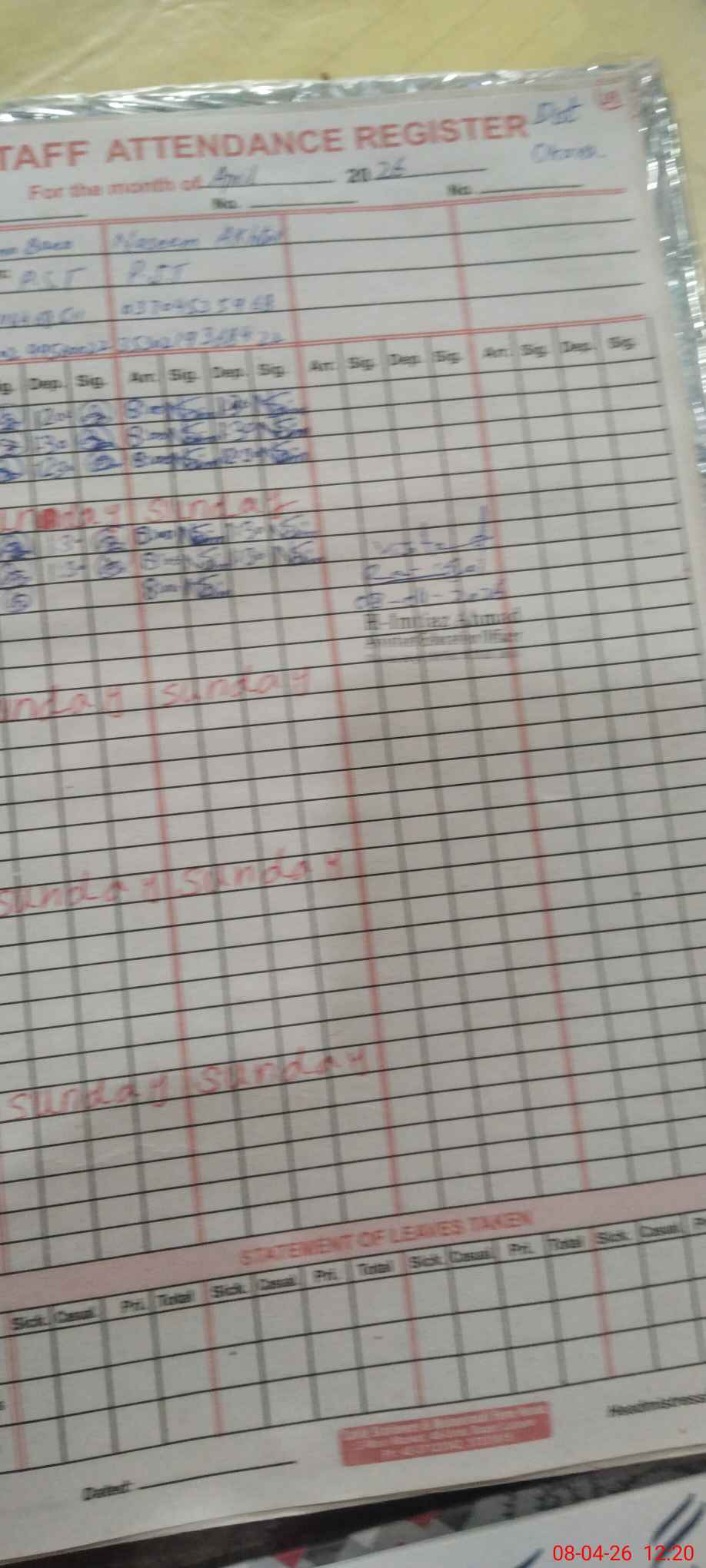 | CNIC | Full Name | Designation | R/C | Absence During Last Calender Month |