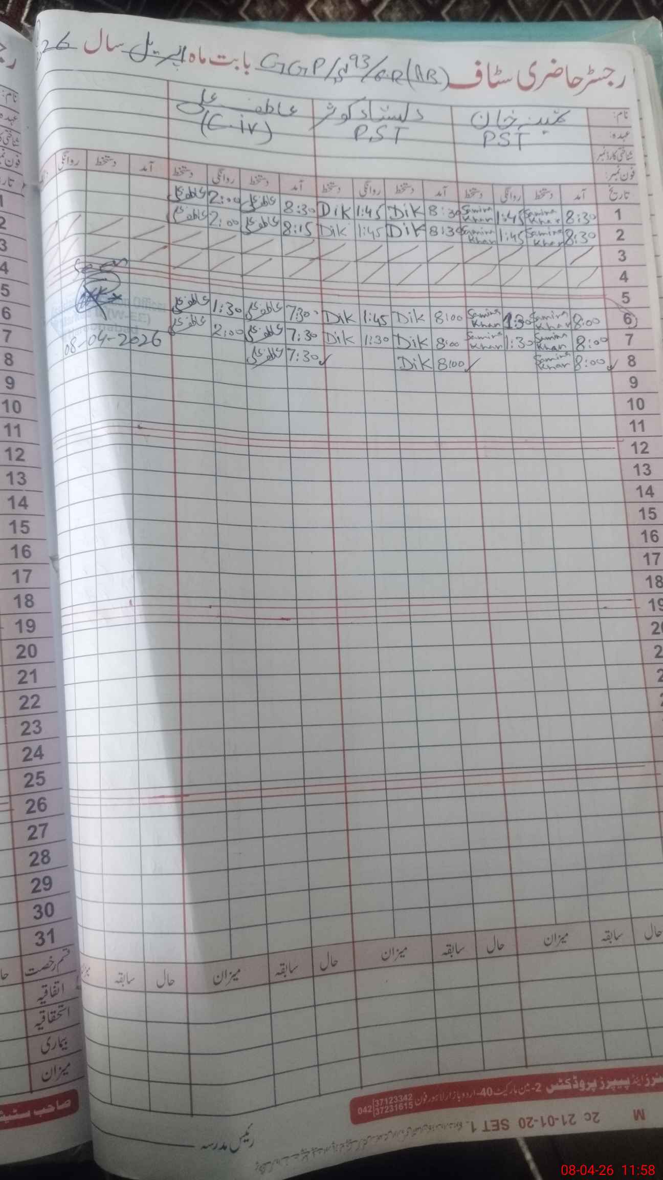 | CNIC | Full Name | Designation | R/C | Absence During Last Calender Month |