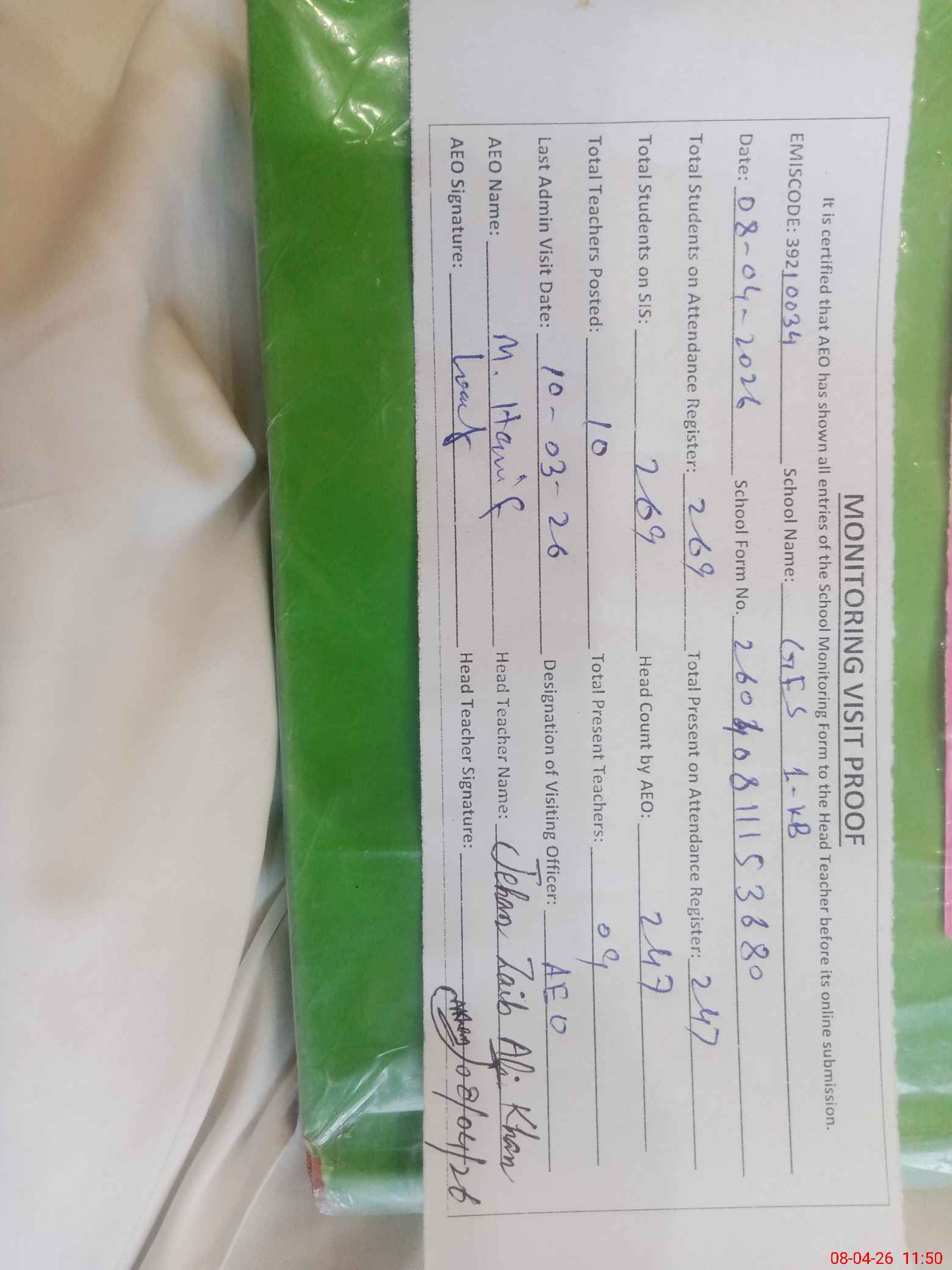 | Attendance Register | Head Teacher | MEA with School | Visit Proof |