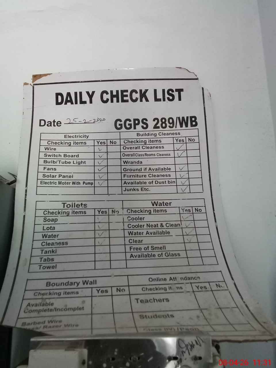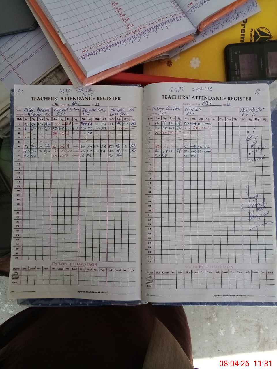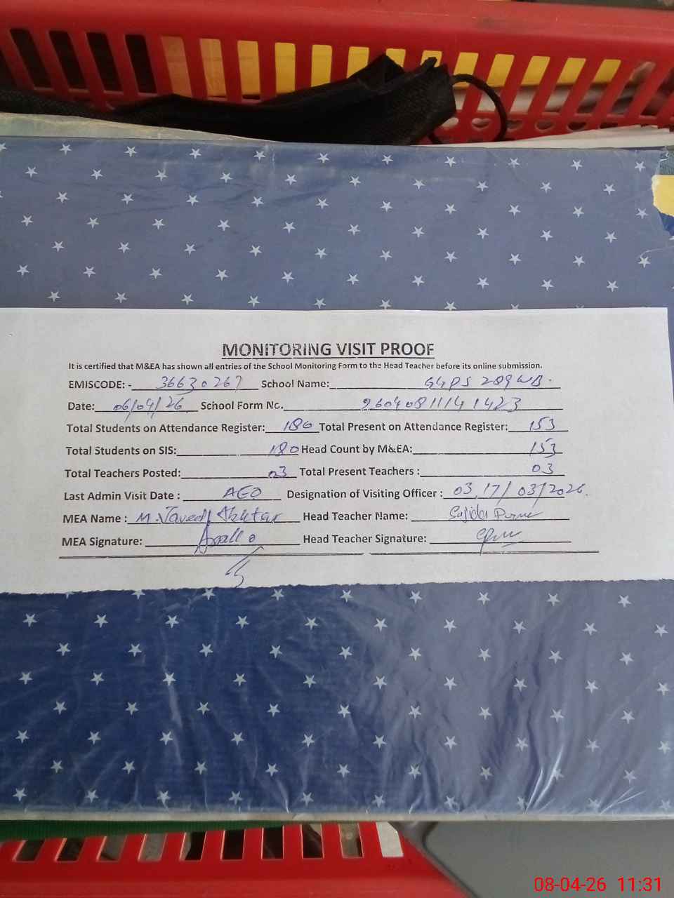 | Attendance Register | Head Teacher | MEA with School | Visit Proof |
