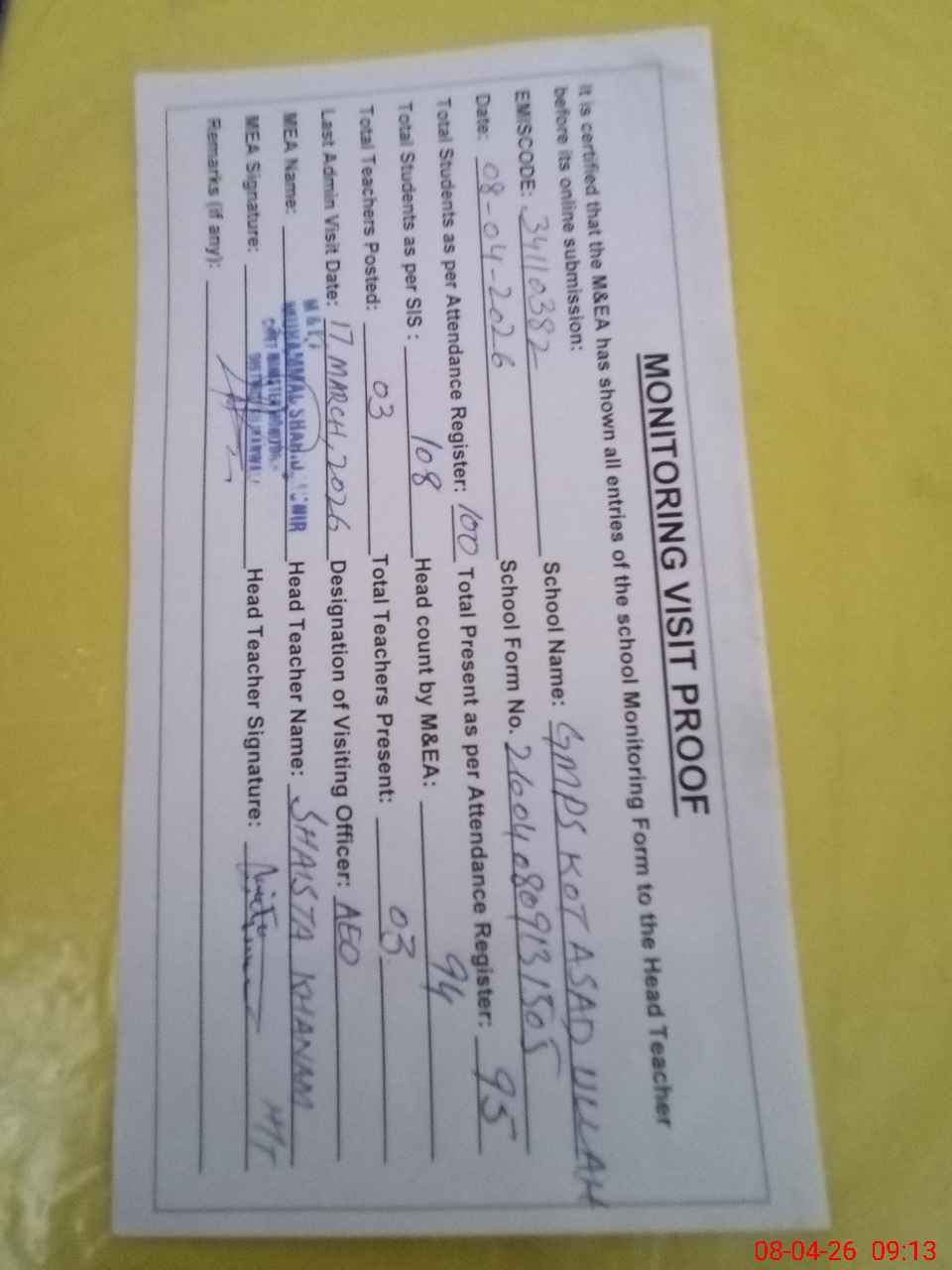 | EMIS Code: 34110382 | Name of School: GMPS KOT ASAD ULLAH | |||