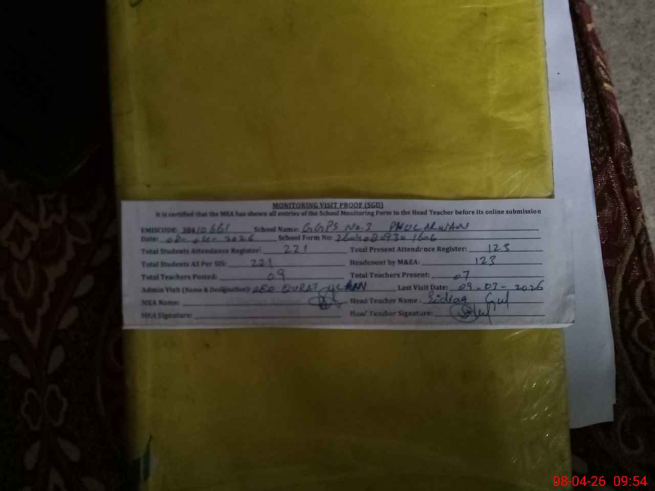 | Attendance Register | Head Teacher | MEA with School | Visit Proof |