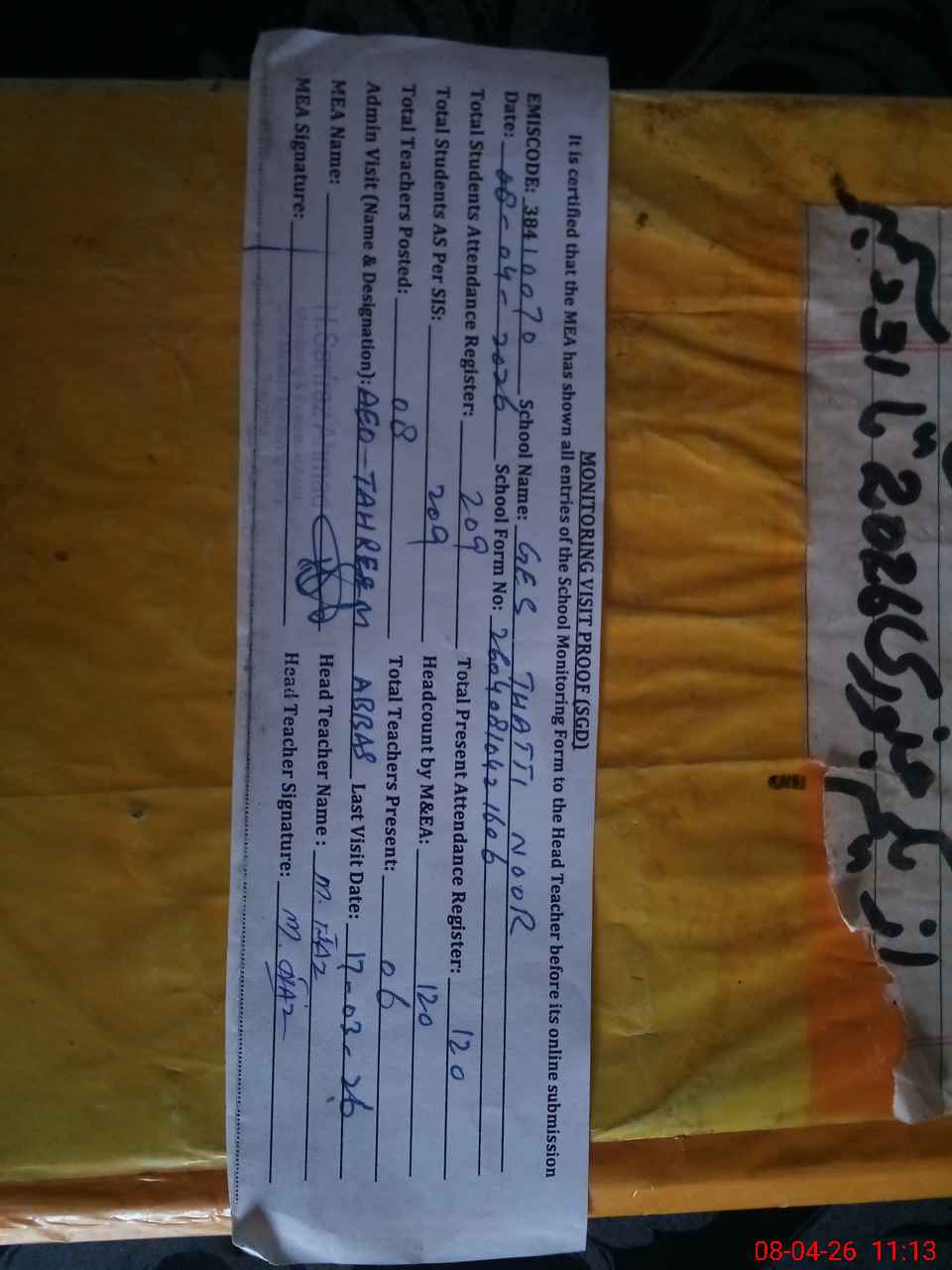 | Attendance Register | Head Teacher | MEA with School | Visit Proof |