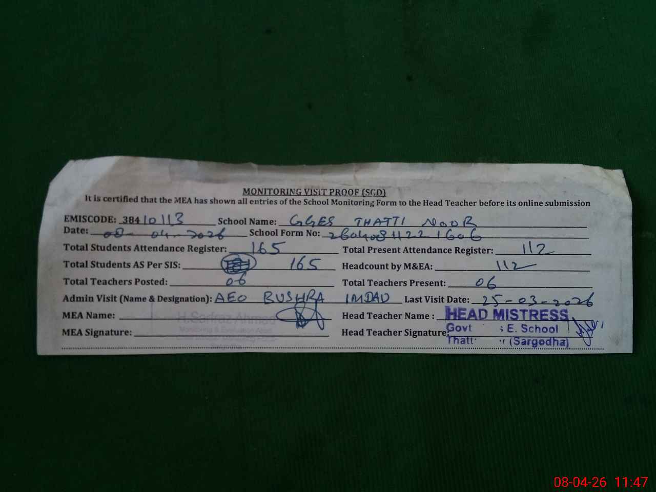 | Attendance Register | Head Teacher | MEA with School | Visit Proof |
