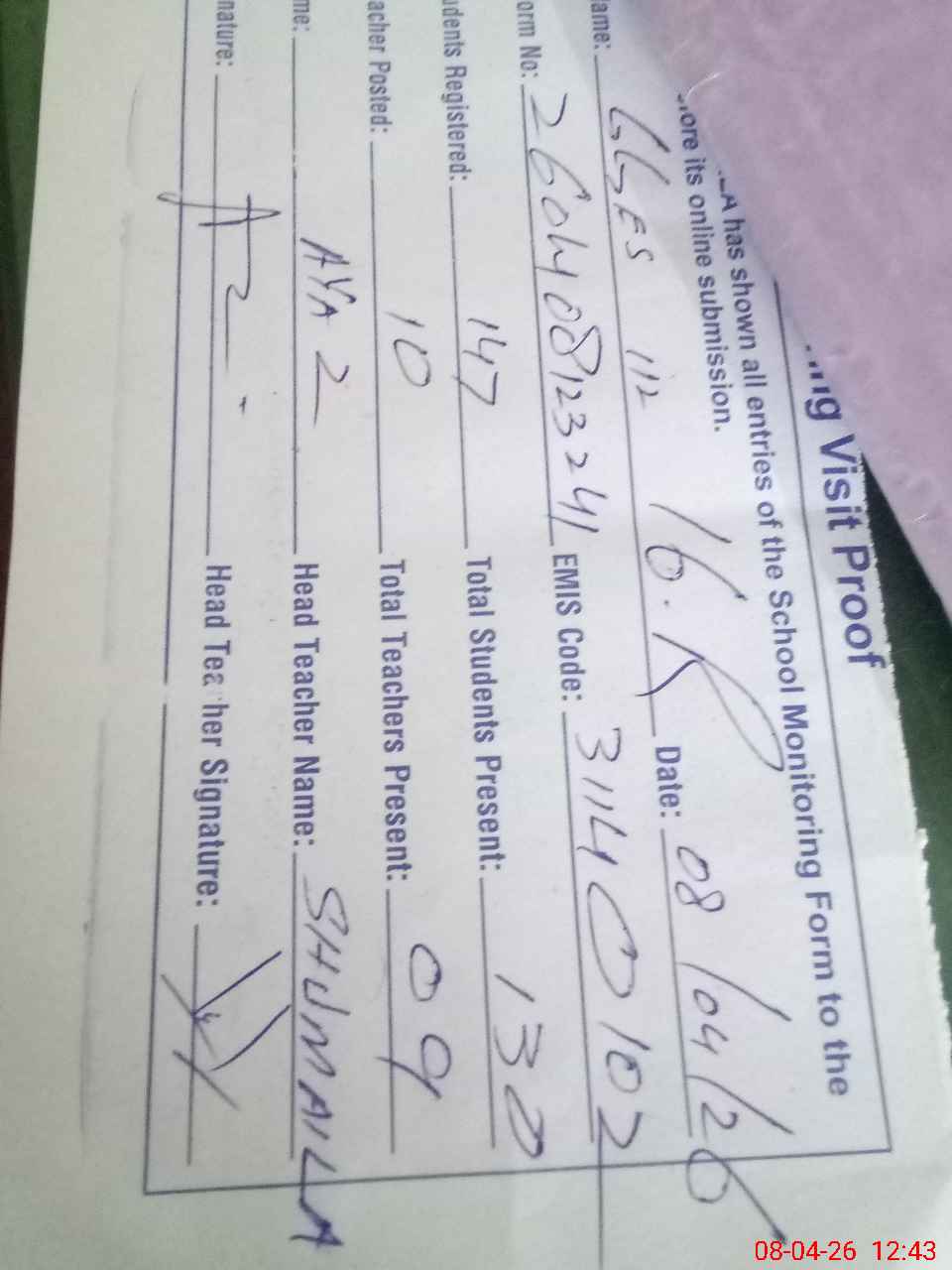 | Attendance Register | Head Teacher | MEA with School | Visit Proof |