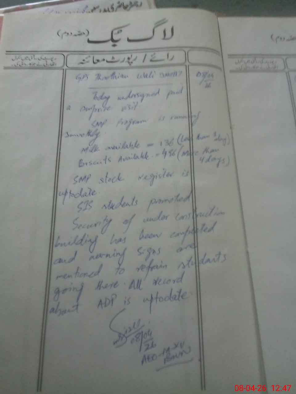 | Certified that this School was Inspected by the Undersigned MEA/DMO Today and the Information Stated Above is as Per Record. | |||||