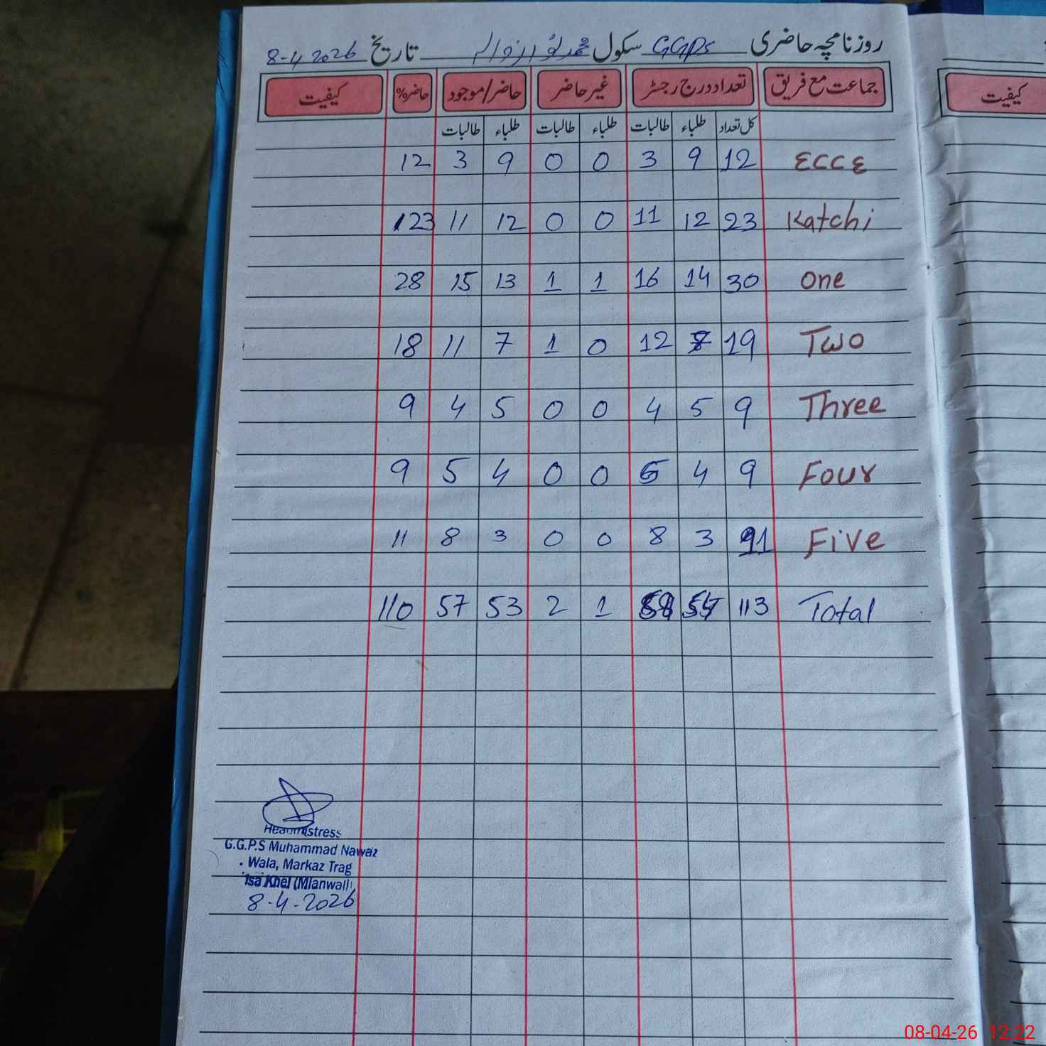| Total Students Present | 0 | 12 | 28 | 18 | 9 | 9 | 11 | 110 | ||||||||