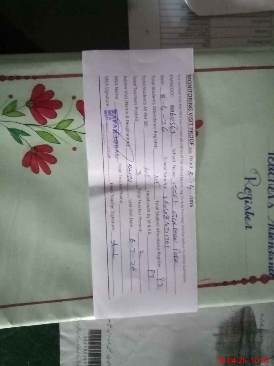 | Attendance Register | Head Teacher | MEA with School | Visit Proof |