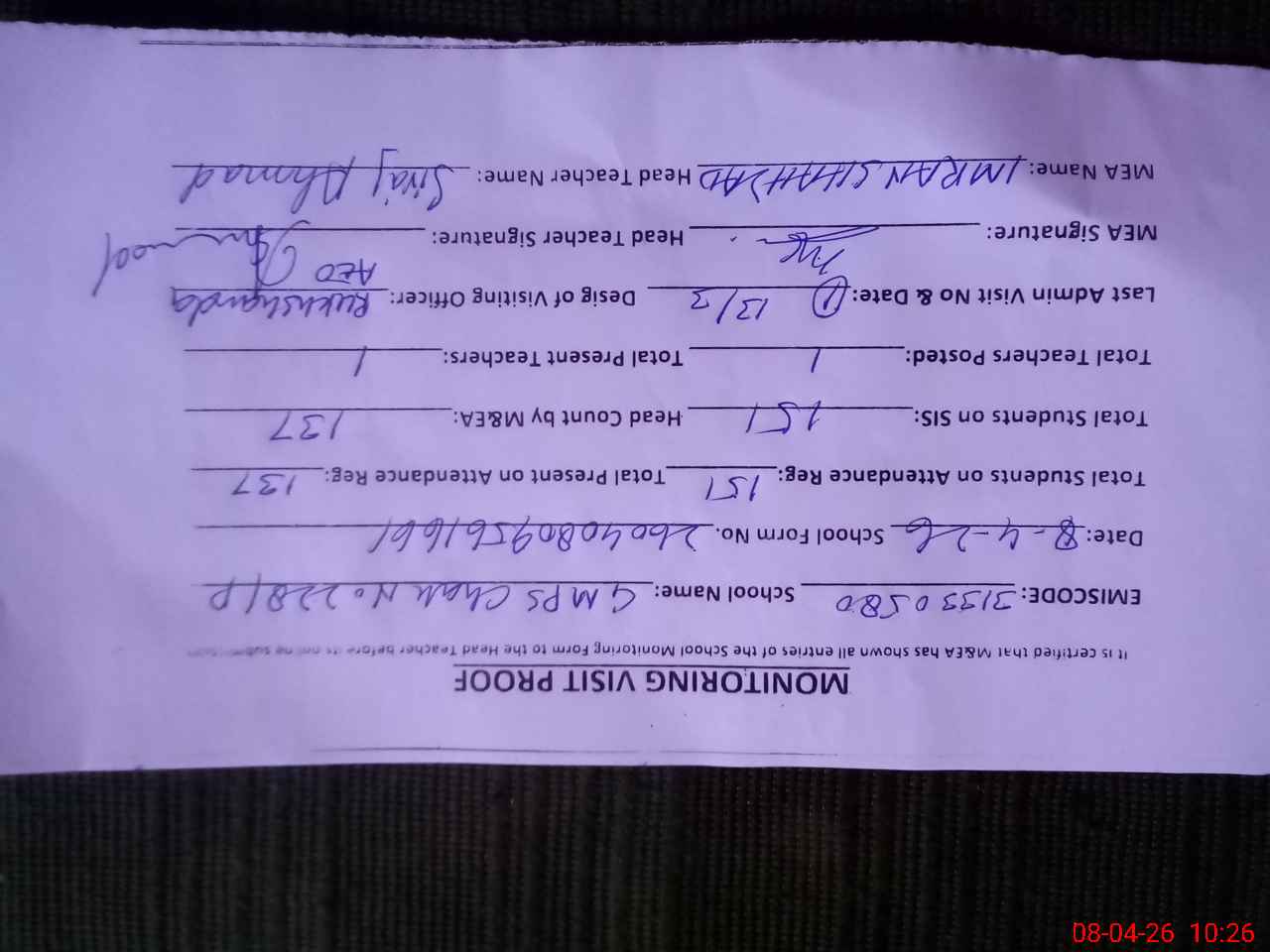 | Attendance Register | Head Teacher | MEA with School | Visit Proof |