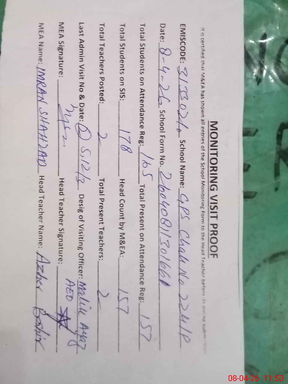 | Attendance Register | Head Teacher | MEA with School | Visit Proof |