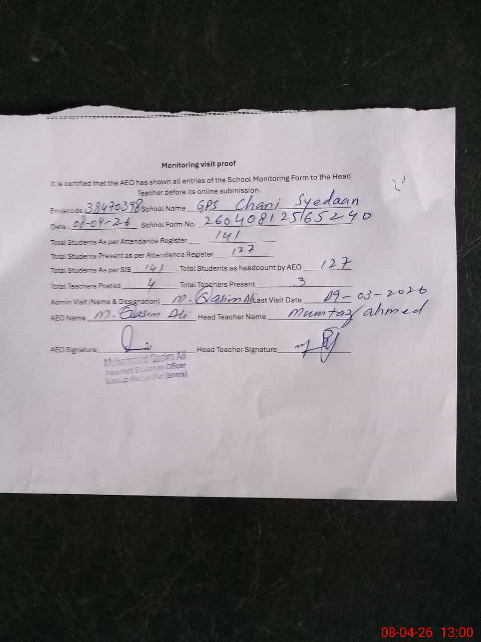| EMIS Code: 38470398 | Name of School: GPS CHHANI SYEDAN | |||