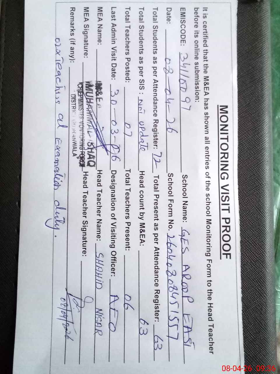 | Remarks (Use Separate Page if Required): SST MUHAMMAD SUFYAN IS ABSENT FROM SCHOOL FROM 01 SEPTEMBER 2025 NQ MUHAMMAD AFZAL IS ON OTHER DUTY AT DY DEO OFFICE FROM 03 OCTOBER 2025 STUDENTS PERMOTED IN NEXT CLASS BUT NOT UPDATE ON SIS YET | |||||