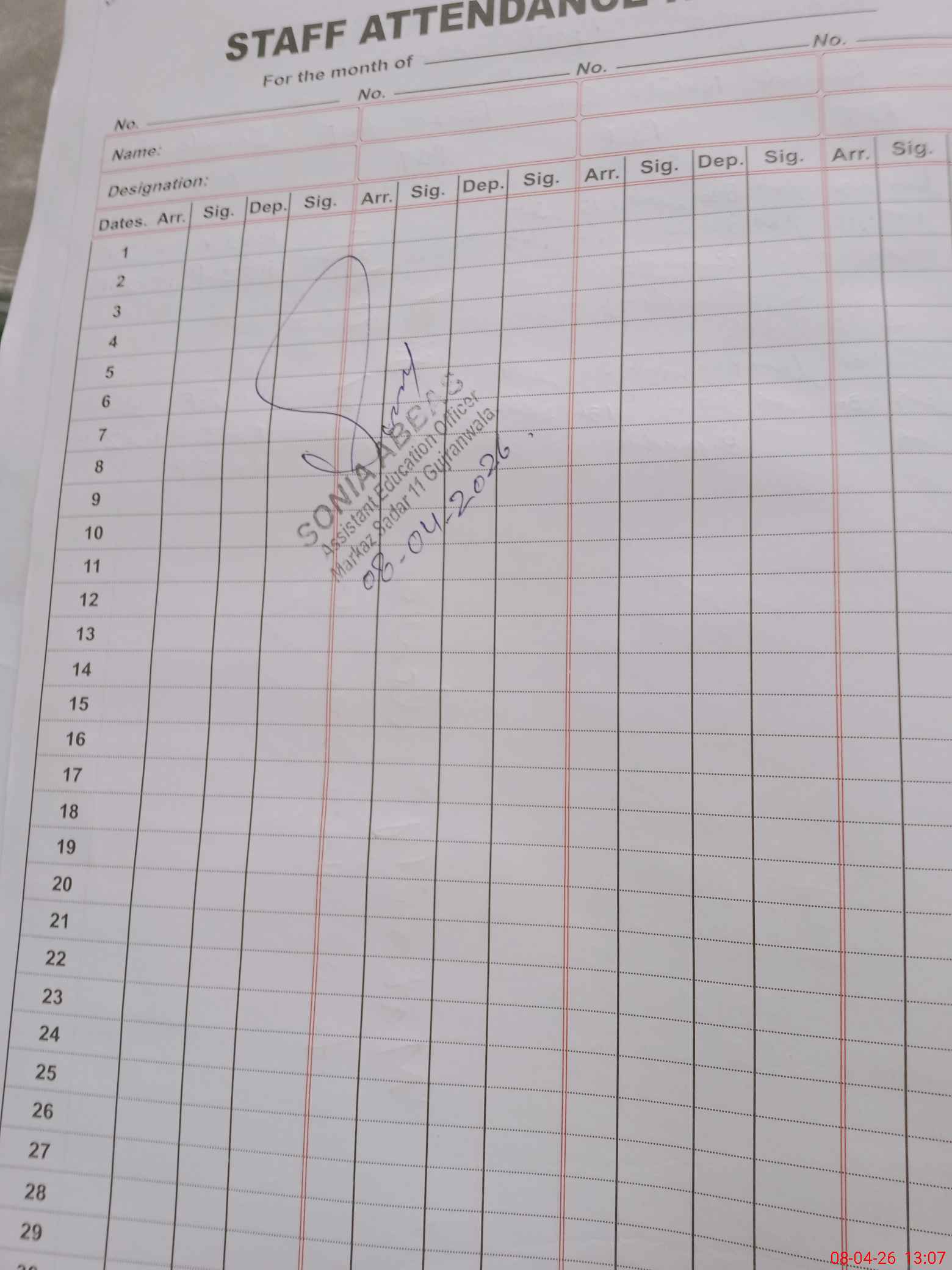 | CNIC | Full Name | Designation | R/C | Absence During Last Calender Month |