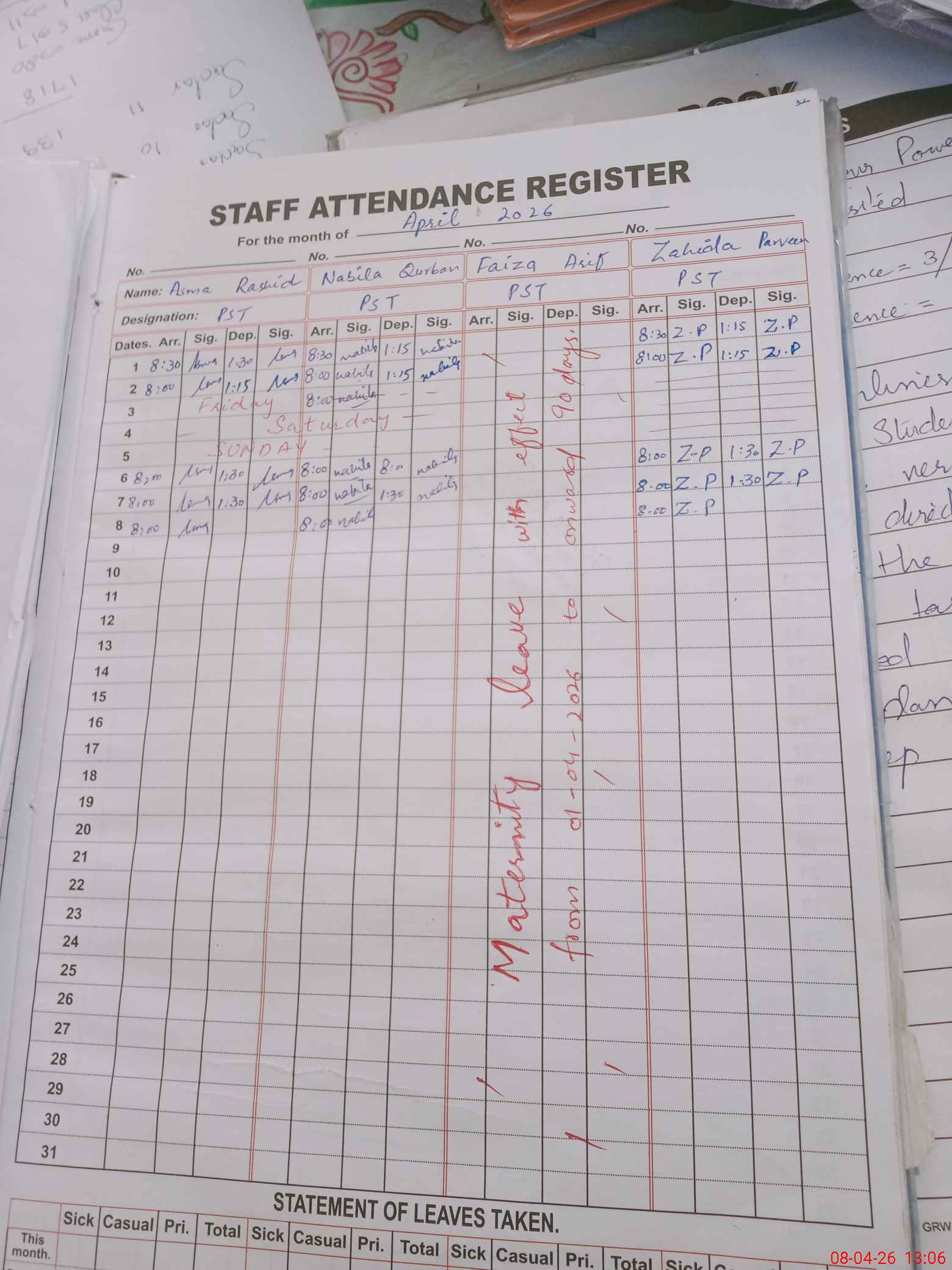 | Leave | Duty | Absent | Maternity | Medical | Ex- Pak |