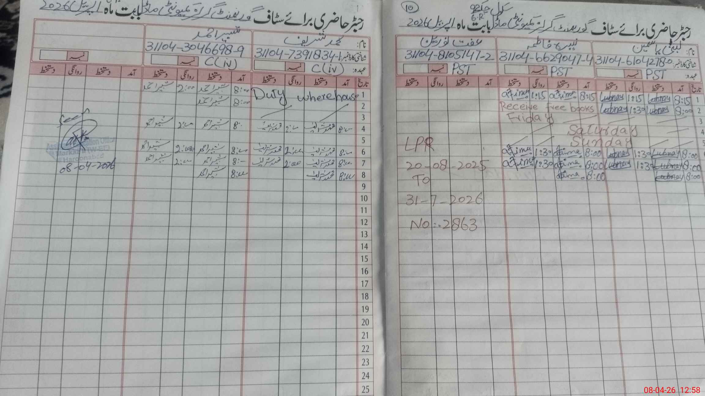 | CNIC | Full Name | Designation | R/C | Absence During Last Calender Month |