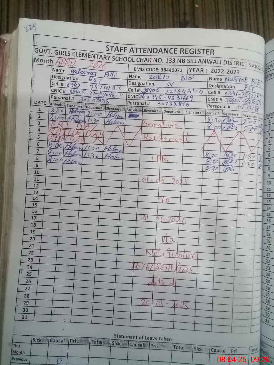 | CNIC | Full Name | Designation | R/C | Absence During Last Calender Month |