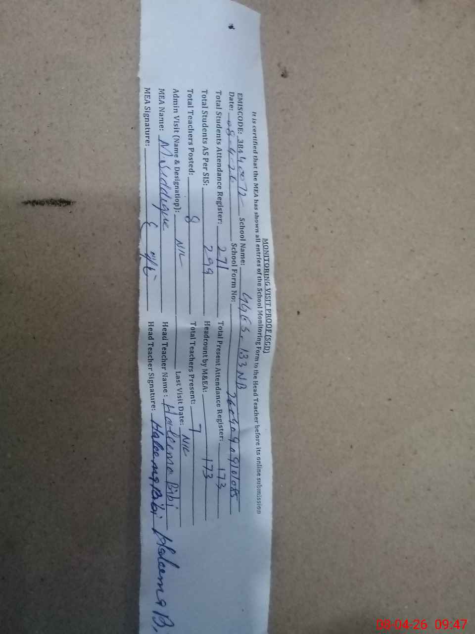 | Attendance Register | Head Teacher | MEA with School | Visit Proof |