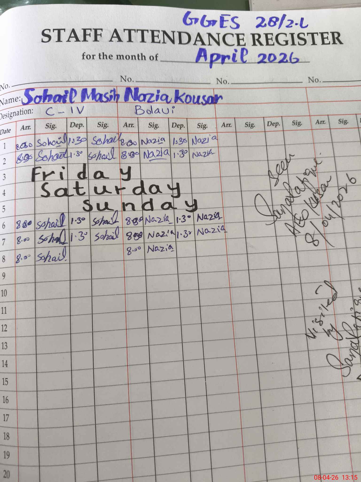 | CNIC | Full Name | Designation | R/C | Absence During Last Calender Month |