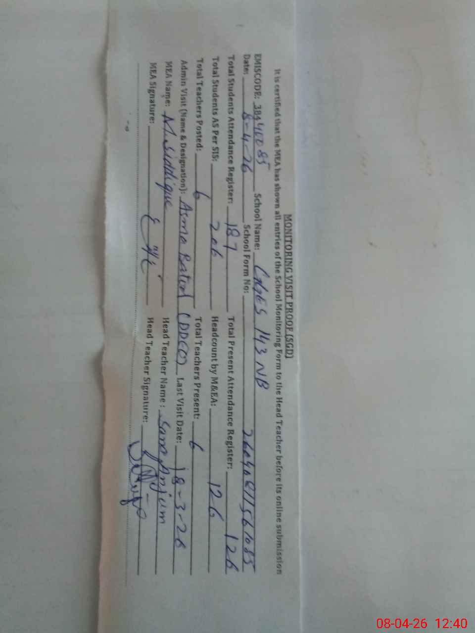 | Attendance Register | Head Teacher | MEA with School | Visit Proof |