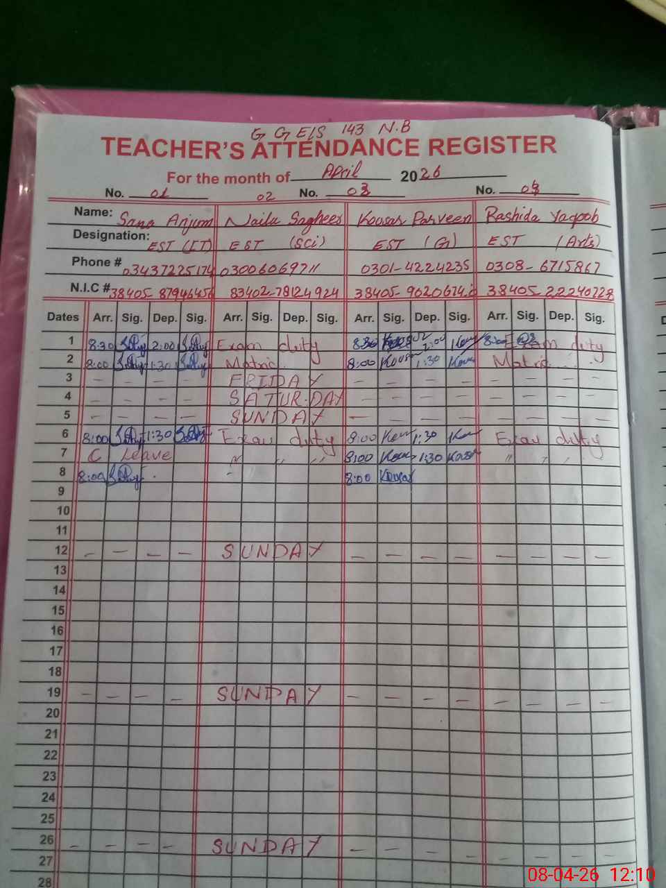 | Name: Sa**** Na**** Designation: (School Headmaster's/Headmistress's) SST Sci Phone/Cell Number: 03**** |
