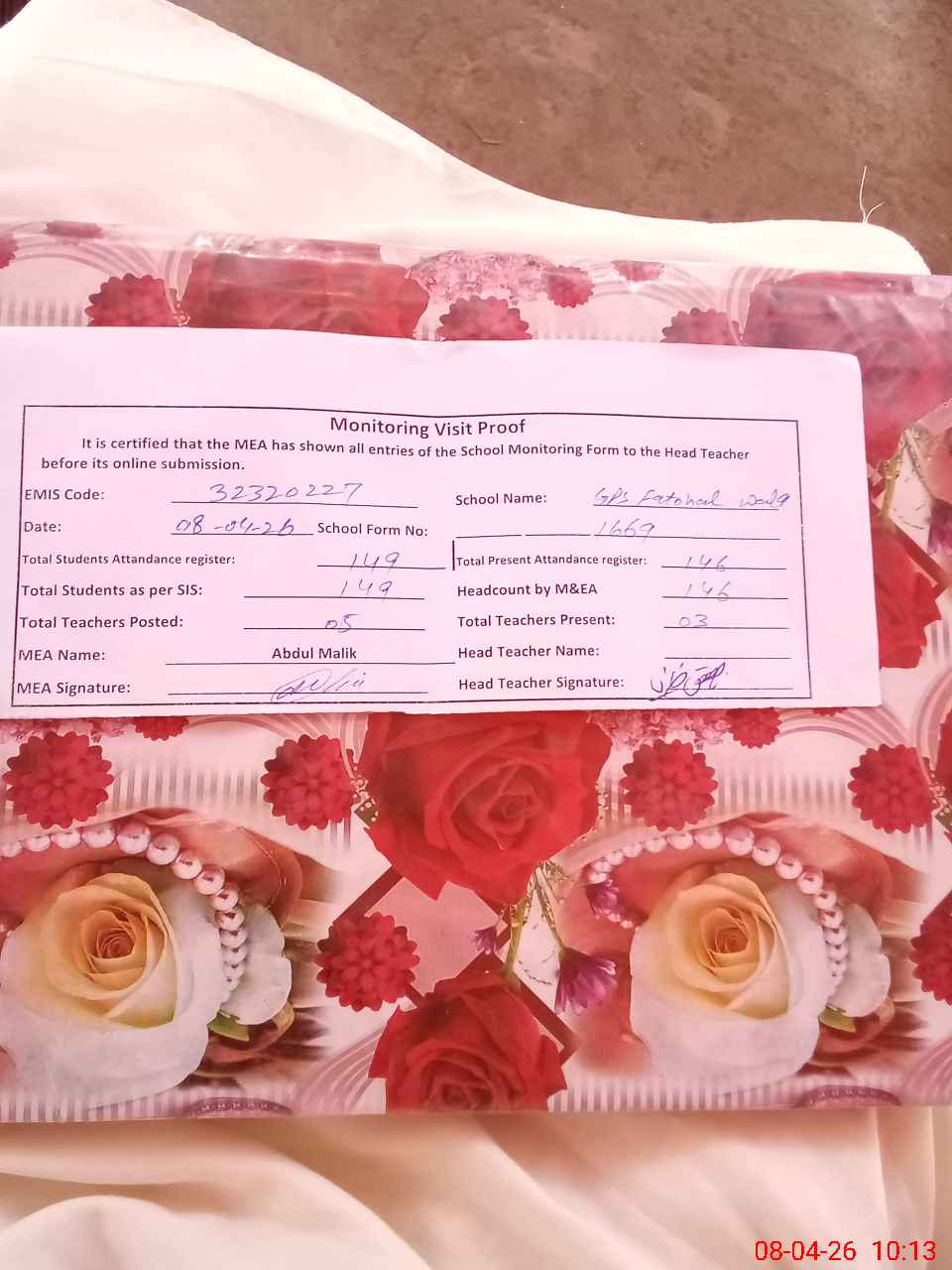 | Attendance Register | Head Teacher | MEA with School | Visit Proof |