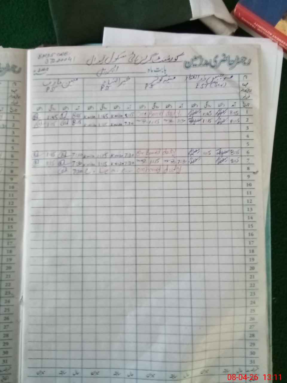 | Remarks (Use Separate Page if Required): EST Teacher Mahjabeen and PST Khair u nisa is absent from school leave not apply. on register fake leave maintain of teacher Khair u nisa. About EST Teacher Not written on teacher attendance register. please check and take action. | |||||