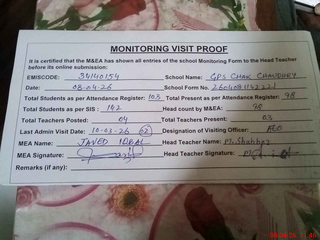 | Attendance Register | Head Teacher | MEA with School | Visit Proof |
