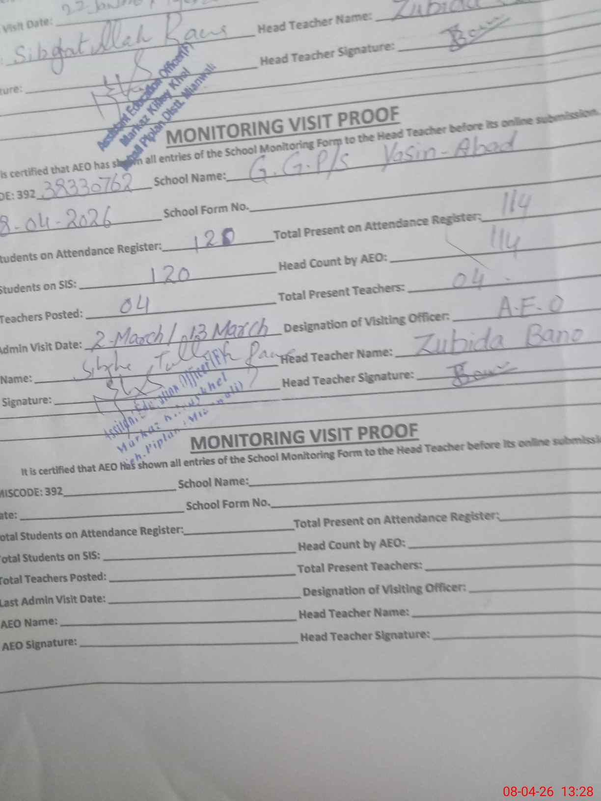 | Attendance Register | Head Teacher | MEA with School | Visit Proof |