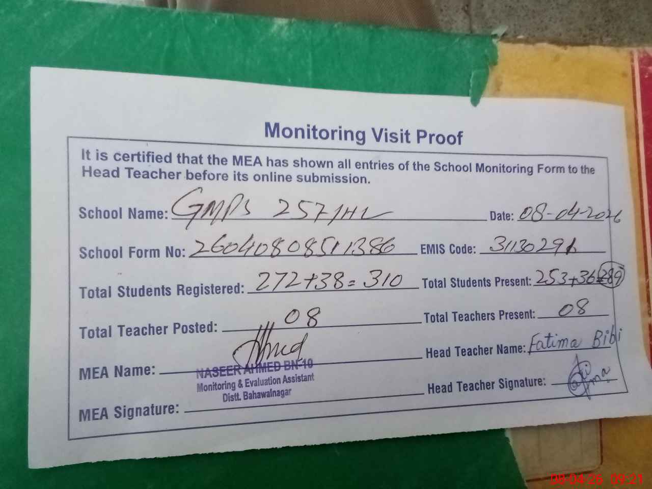 | Attendance Register | Head Teacher | MEA with School | Visit Proof |