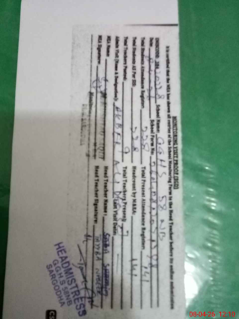 | Name: SA**** SH**** Designation: (School Headmaster's/Headmistress's) SST I/C HEADMISTRESS Phone/Cell Number: 03**** |