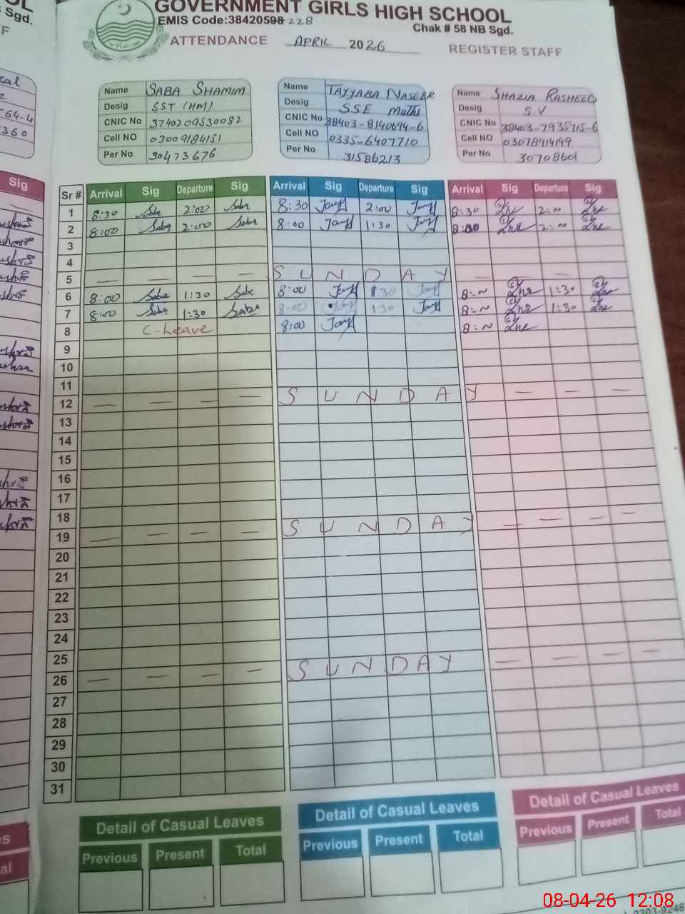 | CNIC | Full Name | Designation | R/C | Absence During Last Calender Month |