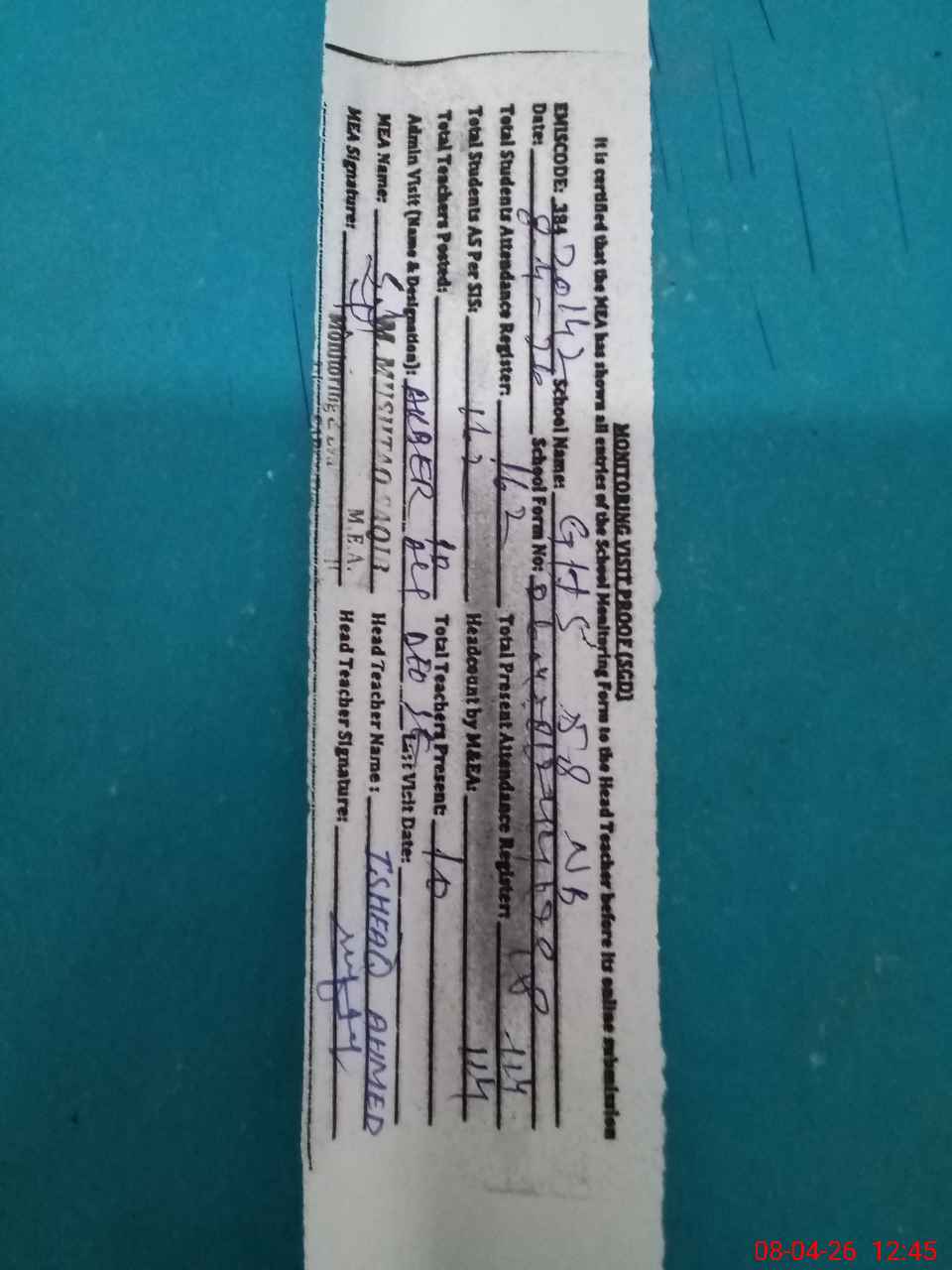 | Attendance Register | Head Teacher | MEA with School | Visit Proof |