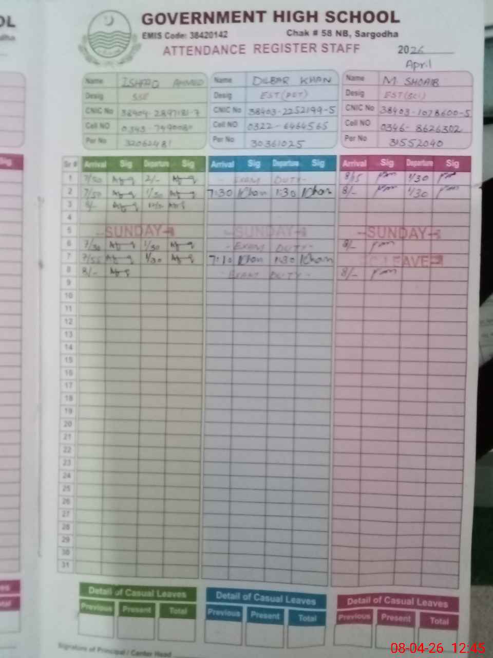 | CNIC | Full Name | Designation | R/C | Absence during last cal. month |