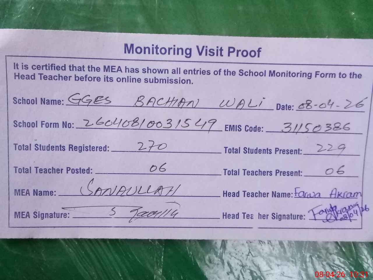 | EMIS Code: 31150386 | Name of School: GGES BACHIAN WALI | |||