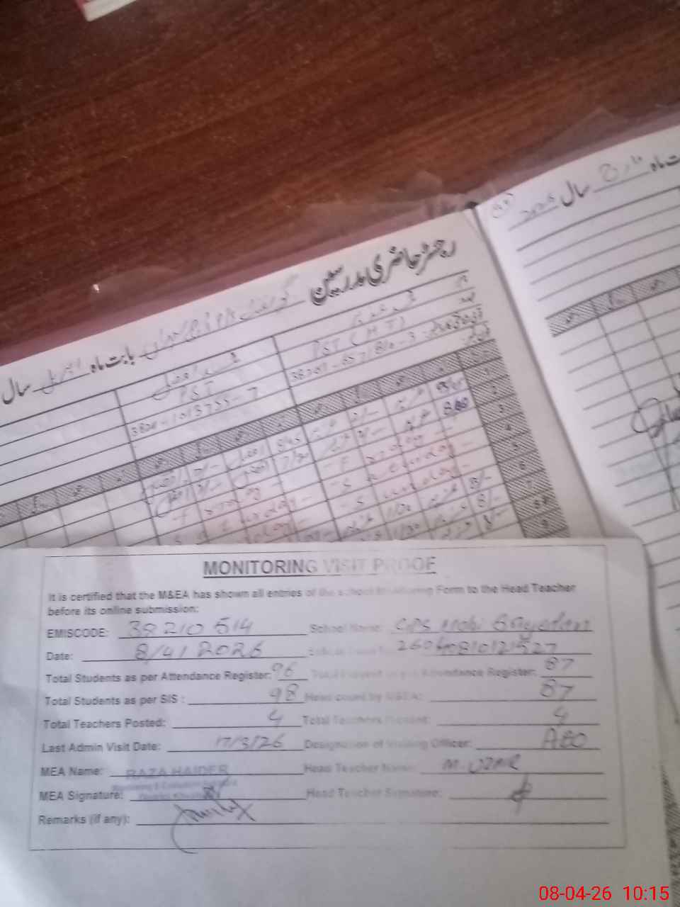 | Attendance Register | Head Teacher | MEA with School | Visit Proof |