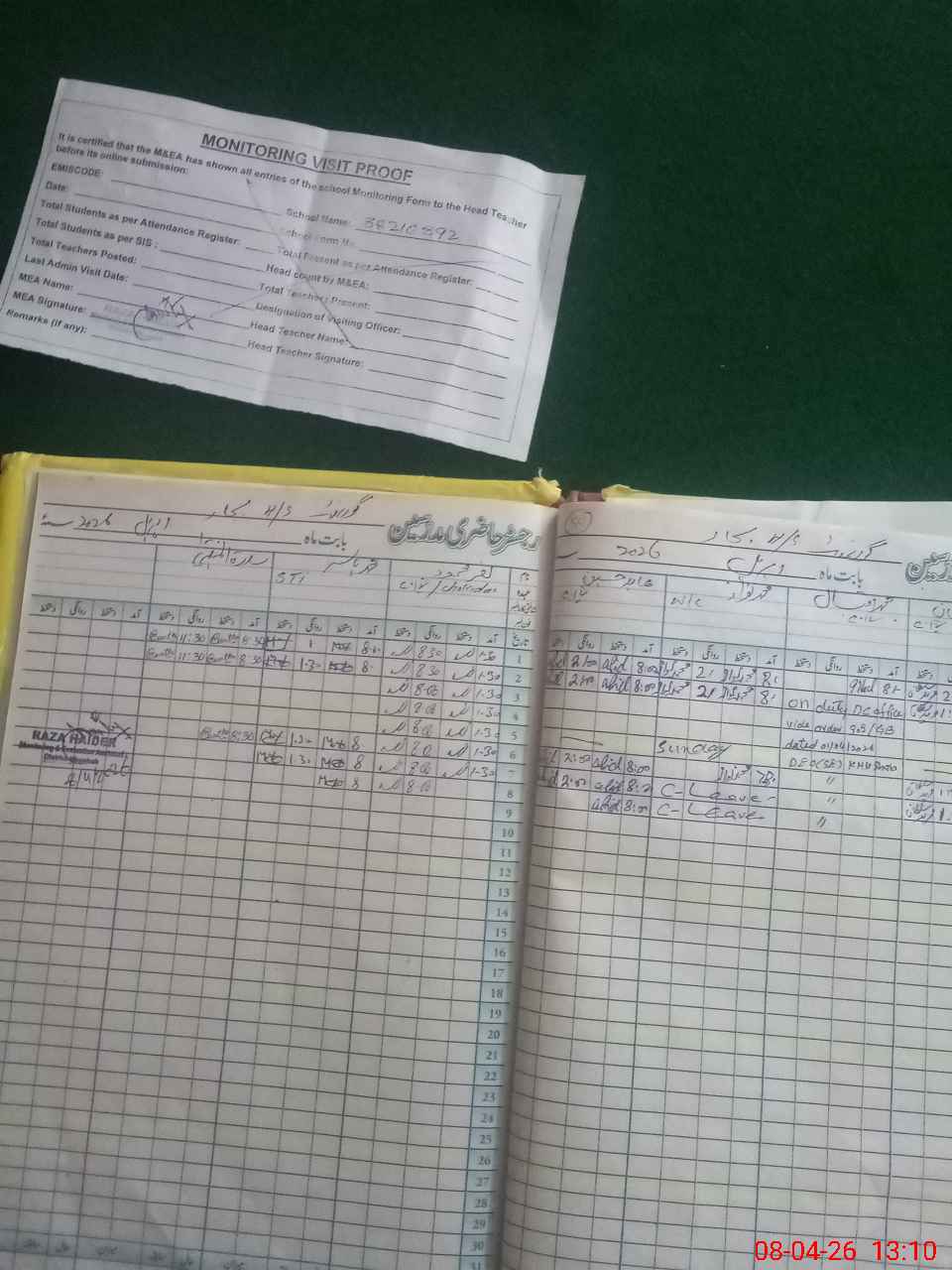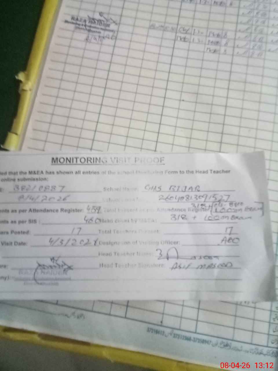 | Attendance Register | Head Teacher | MEA with School | Visit Proof |