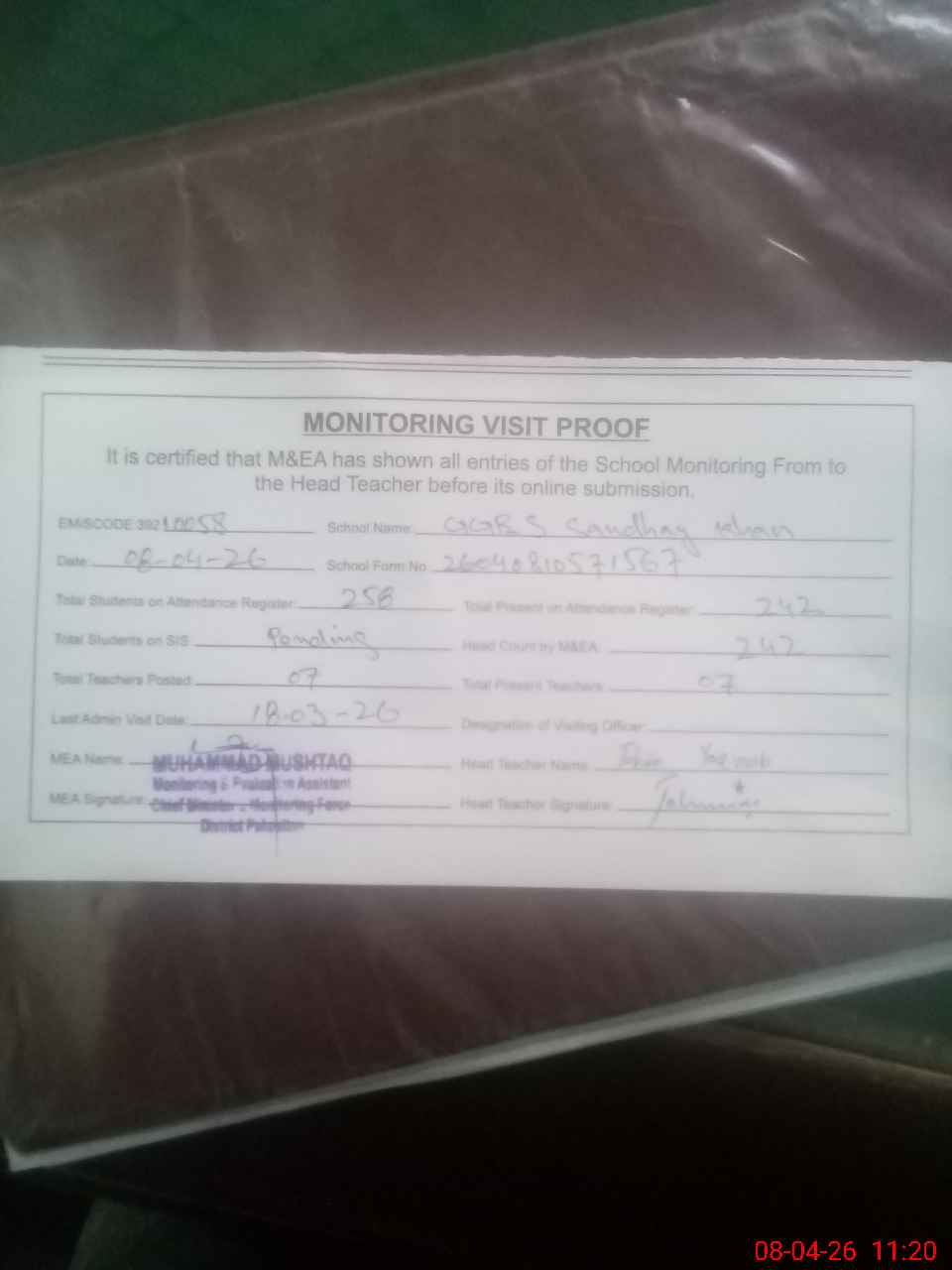 | Attendance Register | Head Teacher | MEA with School | Visit Proof |