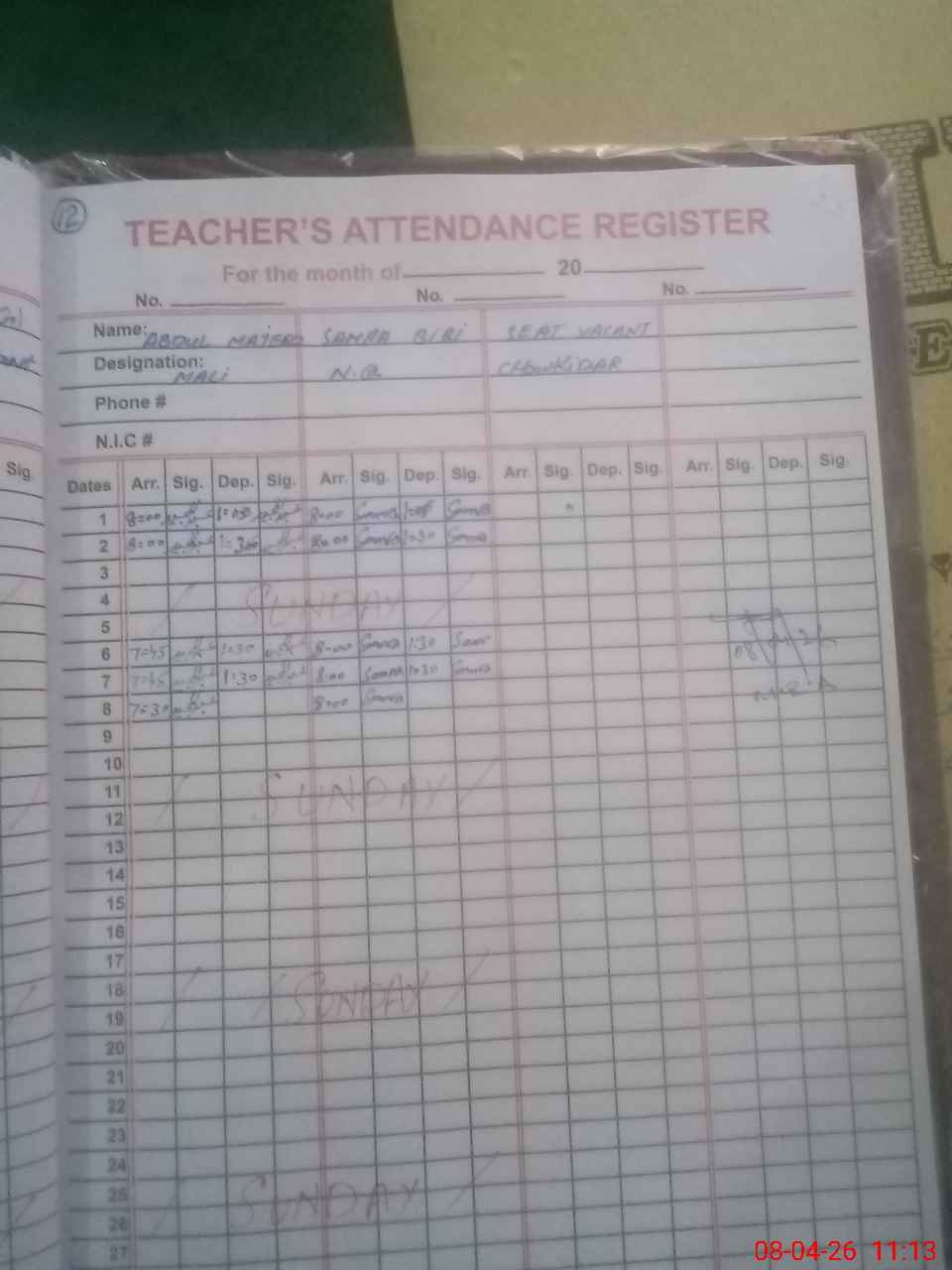 | 36**** | Sa**** Wa**** | SST (Drawing) | Regular | 0 | 0 | 0 | 0 | 0 | 0 | 0 | 0 | 0 | Exam Duty |