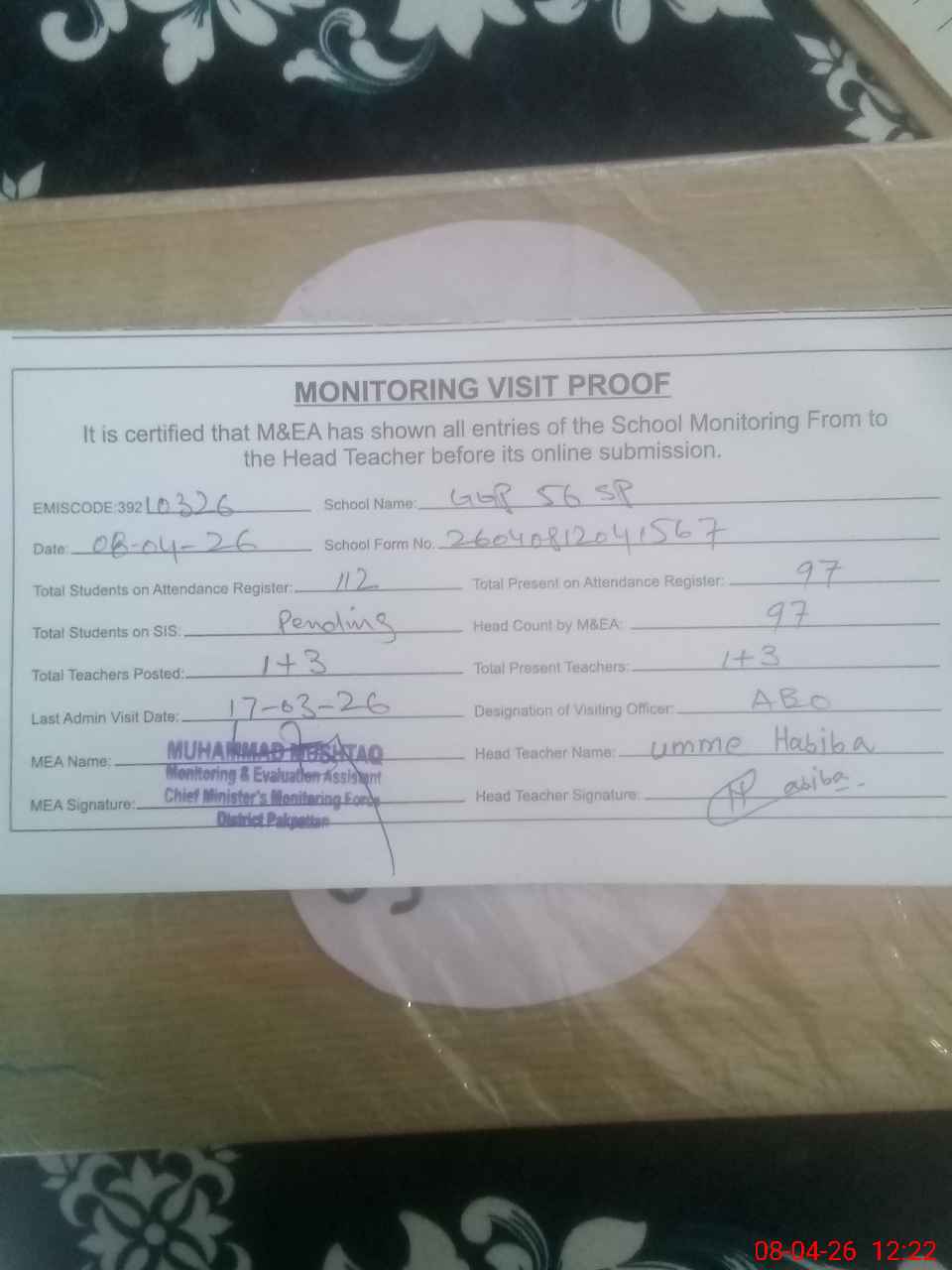 | Attendance Register | Head Teacher | MEA with School | Visit Proof |