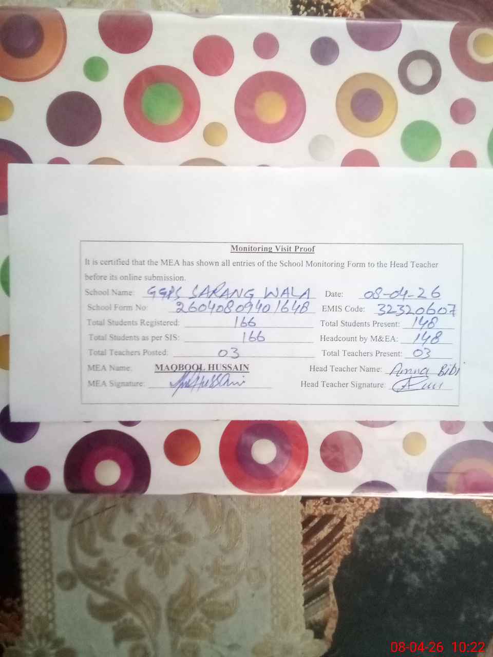 | EMIS Code: 32320607 | Name of School: GGPS SARANG WALA | |||