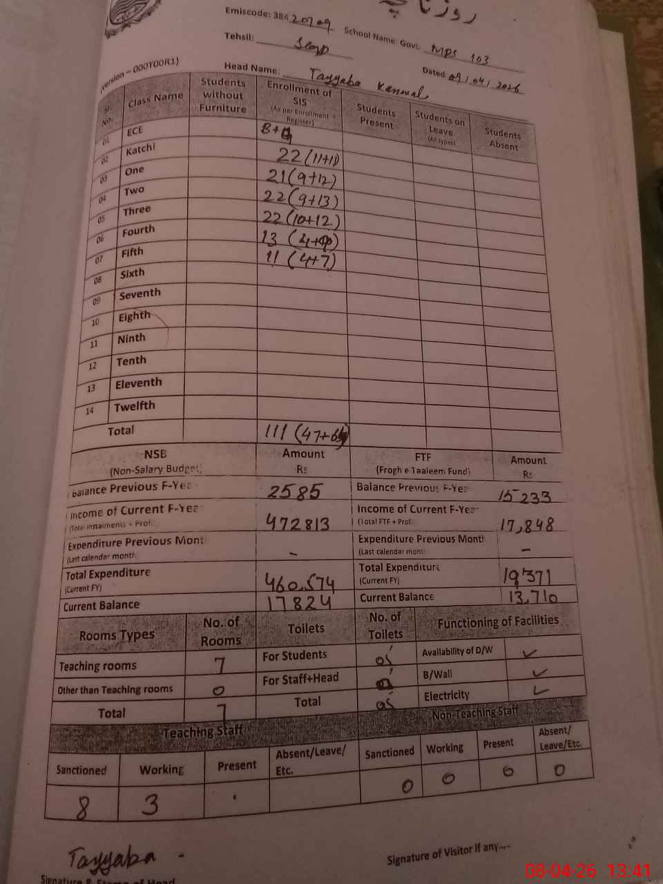| Name: Ta**** Ka**** Designation: (School Headmaster's/Headmistress's) PST Phone/Cell Number: 03**** |