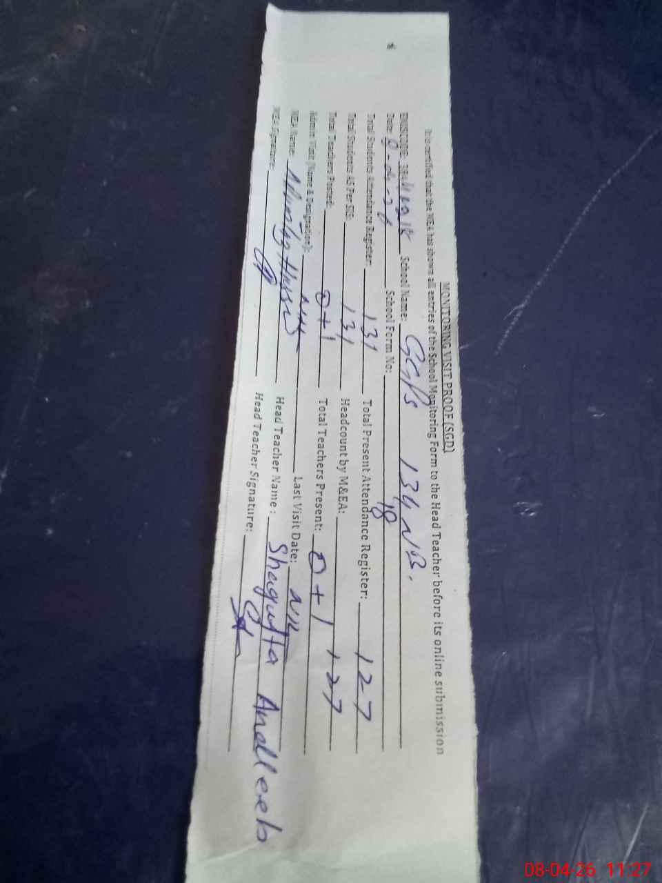 | Attendance Register | Head Teacher | MEA with School | Visit Proof |