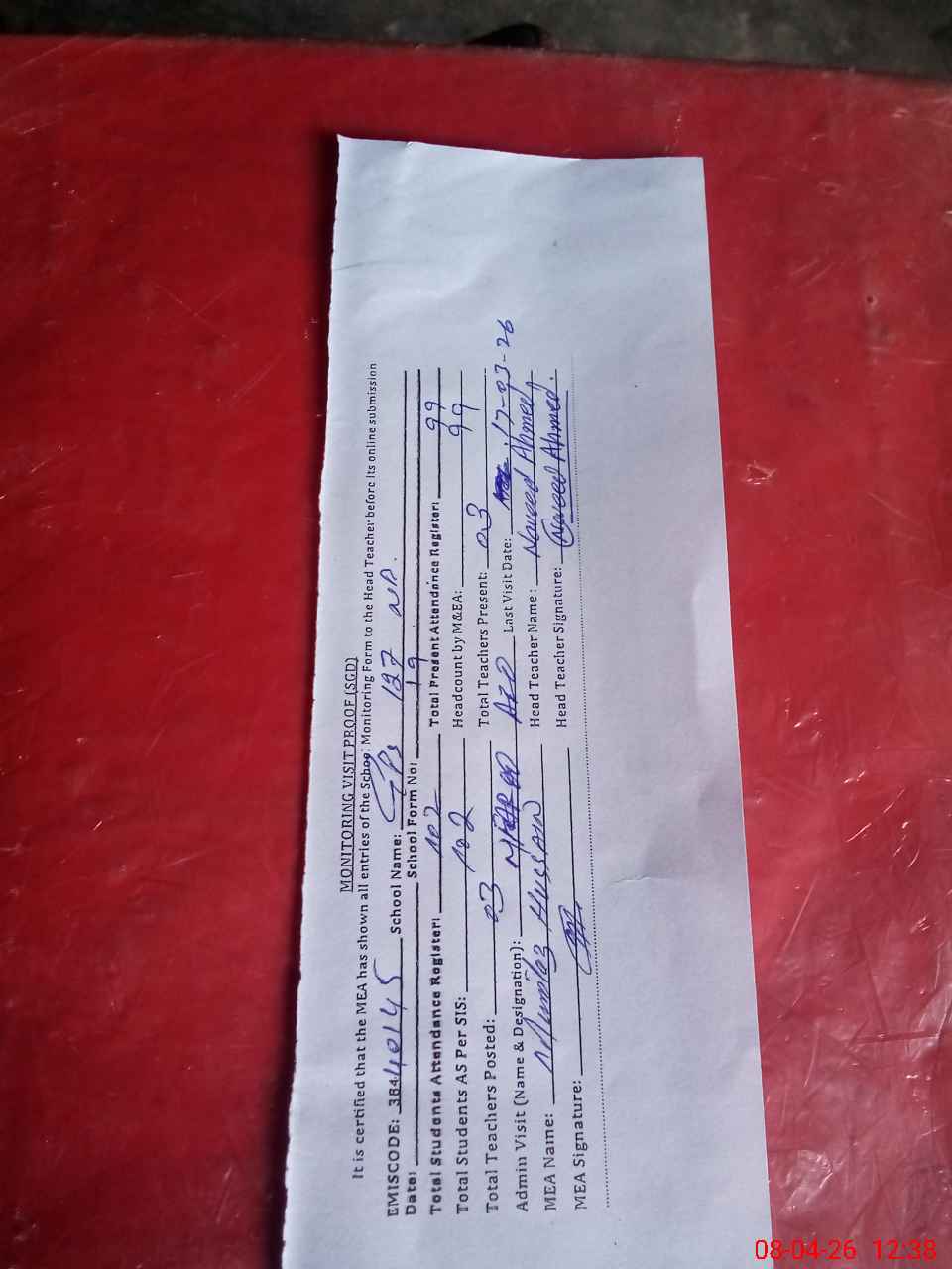 | Attendance Register | Head Teacher | MEA with School | Visit Proof |