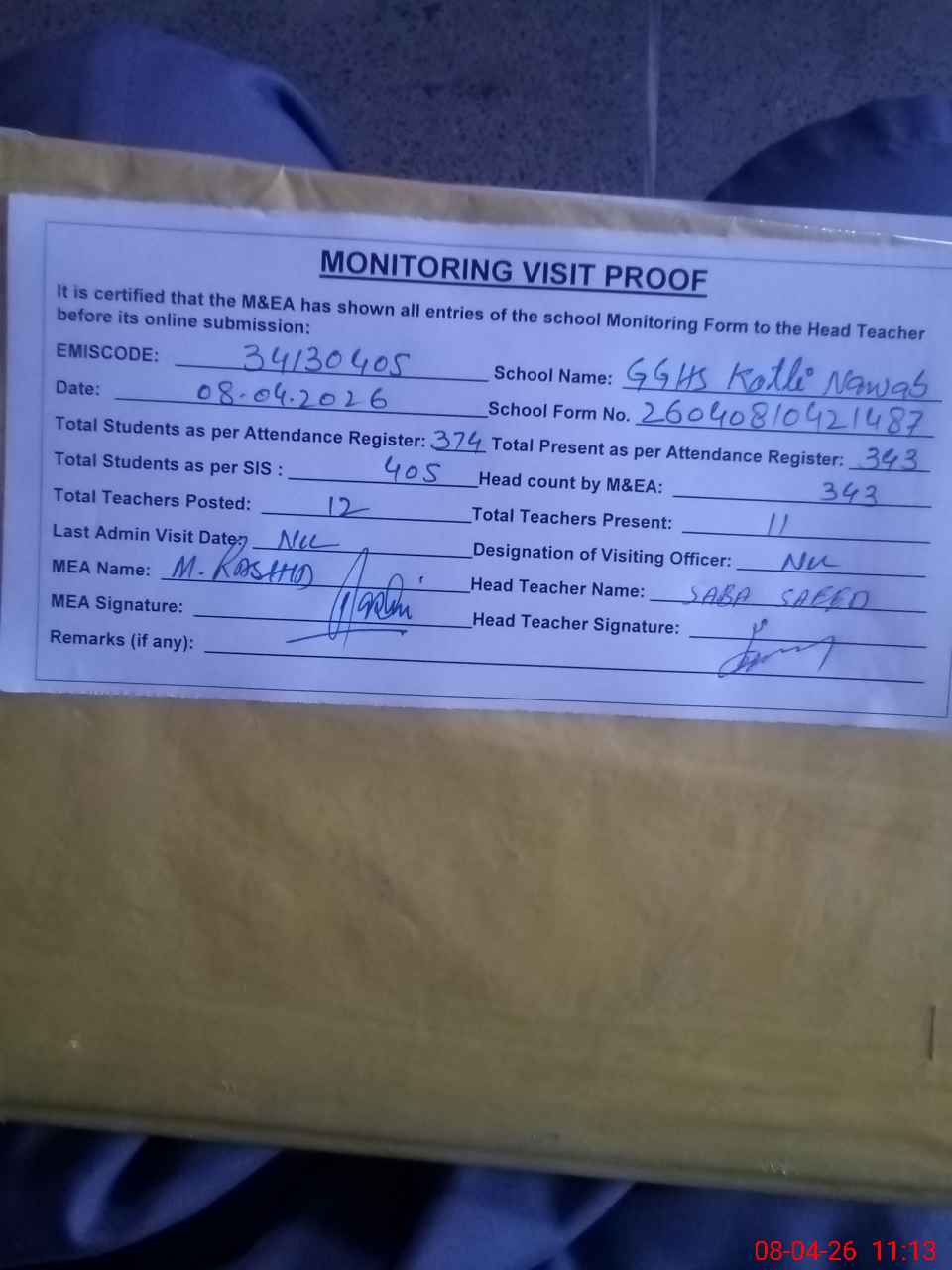 | Attendance Register | Head Teacher | MEA with School | Visit Proof |