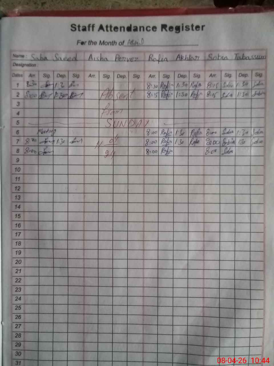 | CNIC | Full Name | Designation | R/C | Absence During Last Calender Month |